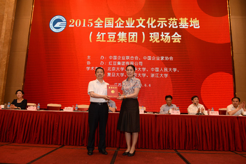 6月6日,在無錫市紅豆杉莊舉辦的2015全國企業(yè)文化示范基地(紅豆集團(tuán))現(xiàn)場會上,紅豆集團(tuán)被中國企業(yè)聯(lián)合會、中國企業(yè)家協(xié)會授予“全國企業(yè)