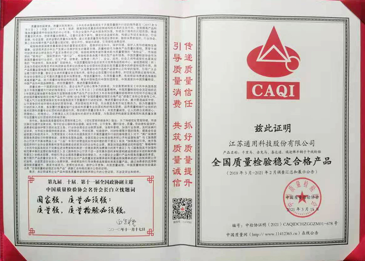 近日,在由中國質量檢驗協會主辦的2021年“3·15”國際消費者權益日“產品和服務質量誠信承諾”主題活動中,通用股份憑借優質的產品性能、穩定的產品質量以及完善的售后服務,榮獲“全國產品和服務質量誠信示范企業”、“全國質量檢驗穩定合格產品”兩項榮譽,體現了中國質量檢驗協會對通用股份多年來專注產品品質、誠信經營的肯定。